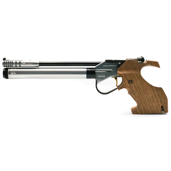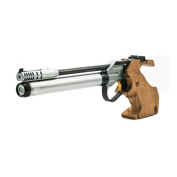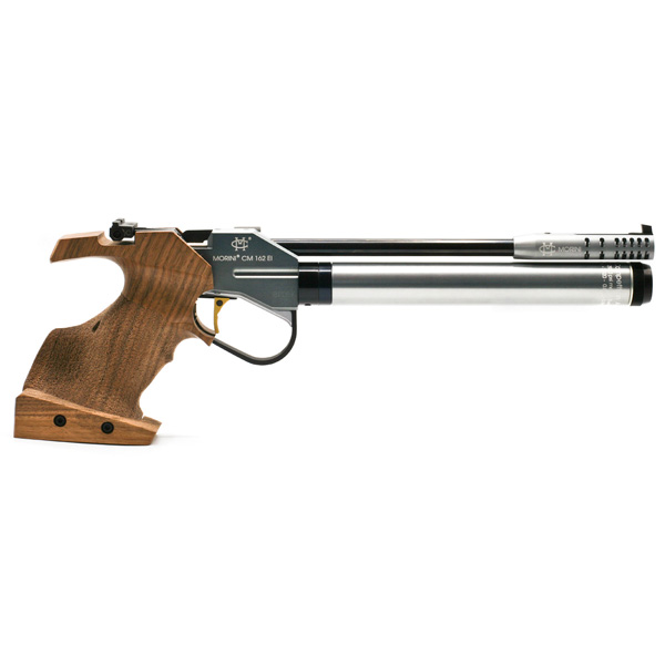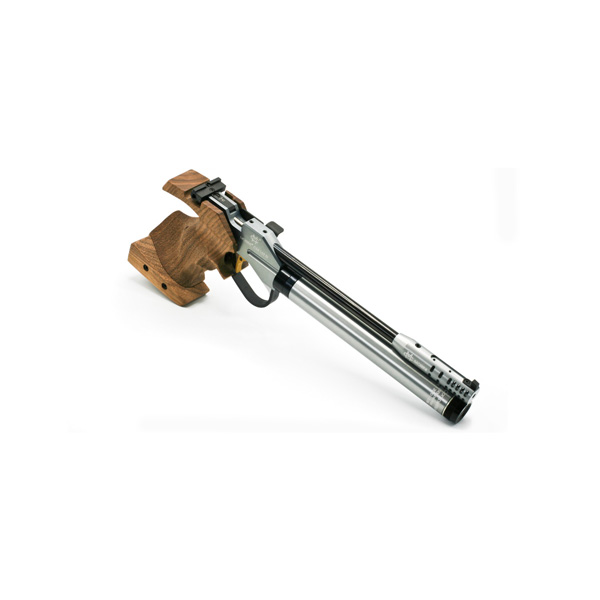 - anatomisch geformter Morini-Nussbaumgriff mit verstellbarer Handballenauflage in verschiedenen Größen für Rechts- und Linksschützen lieferbar