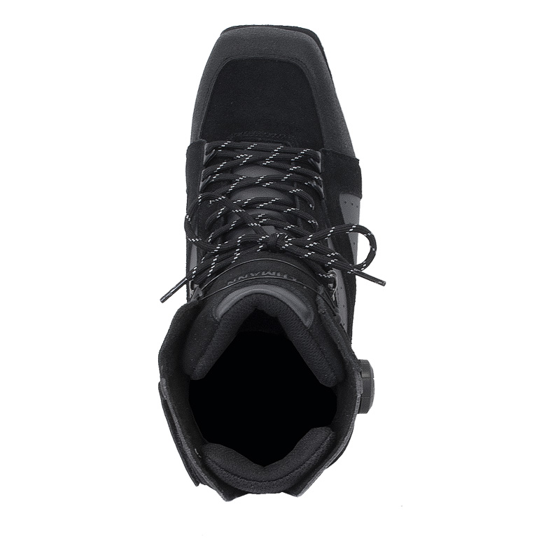 - Der nach unten gedrückte Knopf ermöglicht durch ein Drehen im Uhrzeigersinn ein schnelles Anpassen des Schafts an das Bein. Dadurch wird das Hin- und Herrutschen des Fußes im Schuh verhindert und gleichzeitig die Stabilität und der feste Stand des Schützen erhöht.