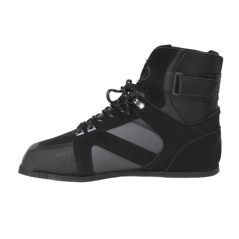 - Maximale Anpassung an das individuelle Bein des Schützen wird durch die Schließe an der Wade ermöglicht, sodass ein schwammiges Gefühl und Wackeln im Schuh verhindert wird. Zusätzlich kann der Schütze durch Öffnen der Schließe unangenehmen Druck auf die Wade beim Kniendschießen mindern.